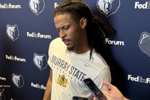 直播吧10月2日讯 莫兰特在训练营特地穿上了母校莫瑞州立大学的T恤。在采访的时候,莫兰特表示自己每天都会穿莫瑞州立大学的装备。