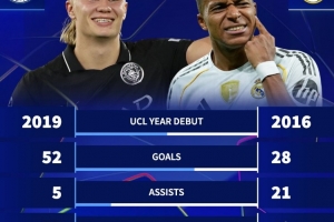 直播吧10月2日讯 本轮欧冠,曼城2-2战平摩纳哥,哈兰德在第50次欧冠出场梅开二度。德转也盘点了目前足坛两大前锋哈兰德、姆巴佩在前50场欧冠数据,具体如下: