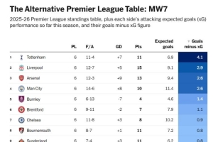 在本赛季英超预期进球值与实际进球值榜单中,热刺是表现最好的,他们实际进球比预期进球多4.1个,利物浦(2.9个)、阿森纳(2.6个)、曼城(2.6个)分居二至四位。