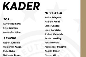 直播吧10月02日讯 德国队公布了新一期世预赛名单,沃尔特马德、维尔茨领衔,基米希、格雷茨卡、格纳布里在列,萨内落选。